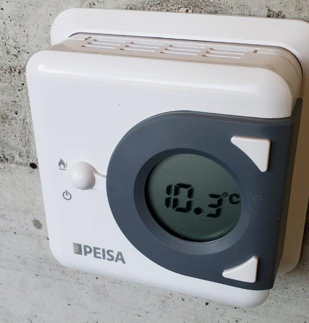 2) EN EL PRIMER PISO HAY UN TERMOSTATO AL FINALIZAR LA ESCALERA QUE EXHIBE LA TEMPERATURA AMBIENTE. CHEQUEAR QUE LA PERILLA DE LA IZQUIERDA ESTE EN LA POSICION SUPERIOR (DIBUJO DE UNA LLAMA) Y PRESIONAR EL BOTON TRIANGULAR SUPERIOR DERECHO Y MANTENERLO UNOS SEGUNDOS PARA FIJAR LA TEMPERATURA DESEADA LO QUE SE HACE CON LOS BOTONES TRIANGULARES DE LA IZQUIERDA. LO IDEAL ES PONERLA A 20 GRADOS.