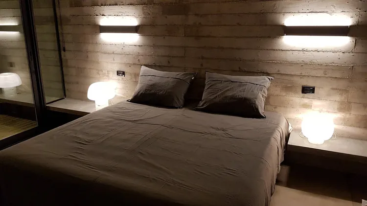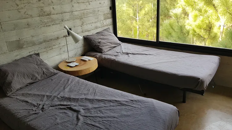 El cuarto principal se encuentra en el piso superior de la casa y tiene una vista vidriada insertada en la copa de los pinos. Cuenta con un sommier Simmons de 2 x 2 con una amplia estructura de hormigón que funciona como un muy cómodo vestidor.